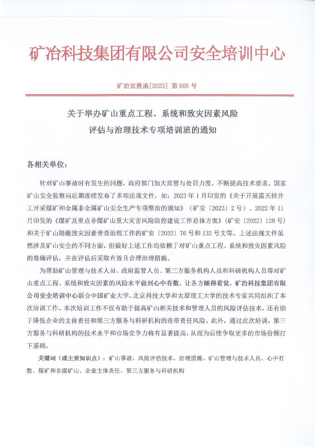 为帮助矿山管理与技术人员、政府监管人员、第三方服务机构人员和科研机构人员等对矿山重点工程、系统和致灾因素的风险水平做到心中有数,让各方睡得着觉,矿冶科技集团有限公司安全培训中心联合中国矿业大学、北京科技大学和太原理工大学的技术专家共同组织了本次培训工作。本次培训工作不仅有助于提高矿山相关技术和管理人员的风险评估技术,还有助于降低企业的主体责任和第三方服务与科研机构的连带责任风险。此外,通过此次培训,第三方服务与科研机构的技术水平和市场竞争力将有显著提高,从而为后续争取更多的市场份额打下基础。
