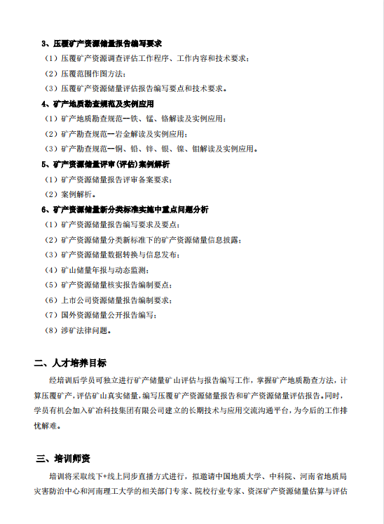 经向上级部门申请,矿冶科技集团有限公司安全培训中心决定举办“矿产资源储量市场管理改革形势分析暨储量报告编写要点”高级培训班。本次培训联合中国地质大学、中科院、河南省地质局灾害防治中心和河南理工大学的技术专家共同组织了本次培训工作。请各单位接此通知后,积极组织本地区、本系统相关单位报名参加学习,现将有关事宜通知如下。